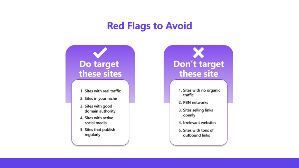 Only target sites with higher DA than yours. If your site has DA 20, aim for DA 30+ sites.